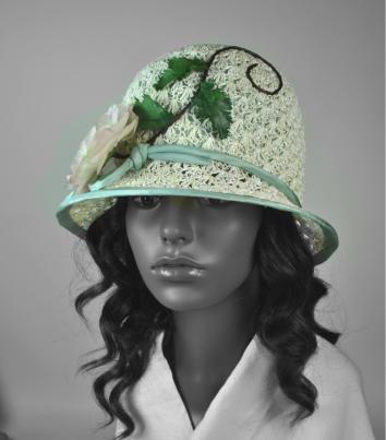 White fancy open straw deep cloche with light aqua blue