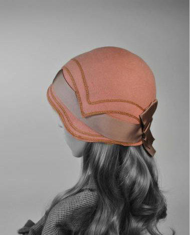 Dusty rose colored felt cloche decorated with narrow rust