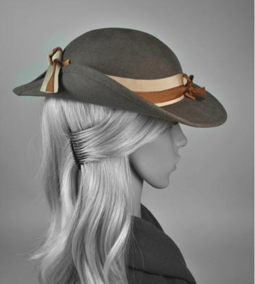 Dark taupe felt hat with beige and rust gross grain ribbon,