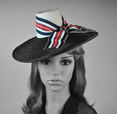 Navy blue brim with white straw toy top hat with red white