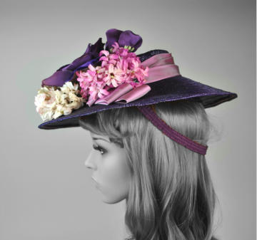 pink, cream and purple flowers. Vintage perching hat.