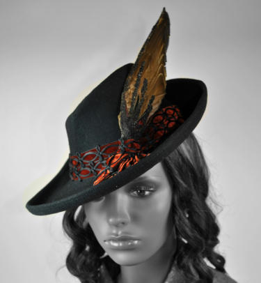 Black felt brimmed hat with green bird wing and rust red