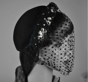 bugle beads on the front of the brim. Soft black veil can