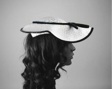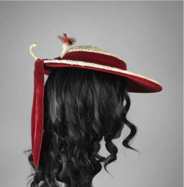 pink flower, black chenille dotted veil. 22 1/2 inches.