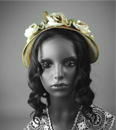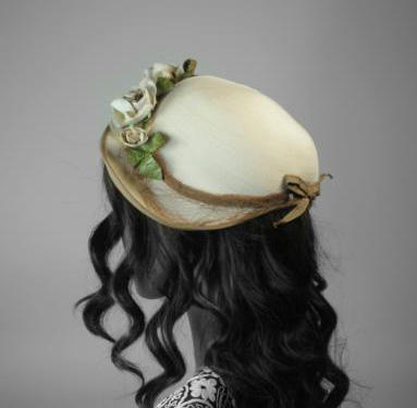 Cream colored, fine straw "Juliet" cap with tan gross grain