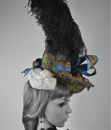 Green and brown brocade Ship hat with blue taffeta ribbon